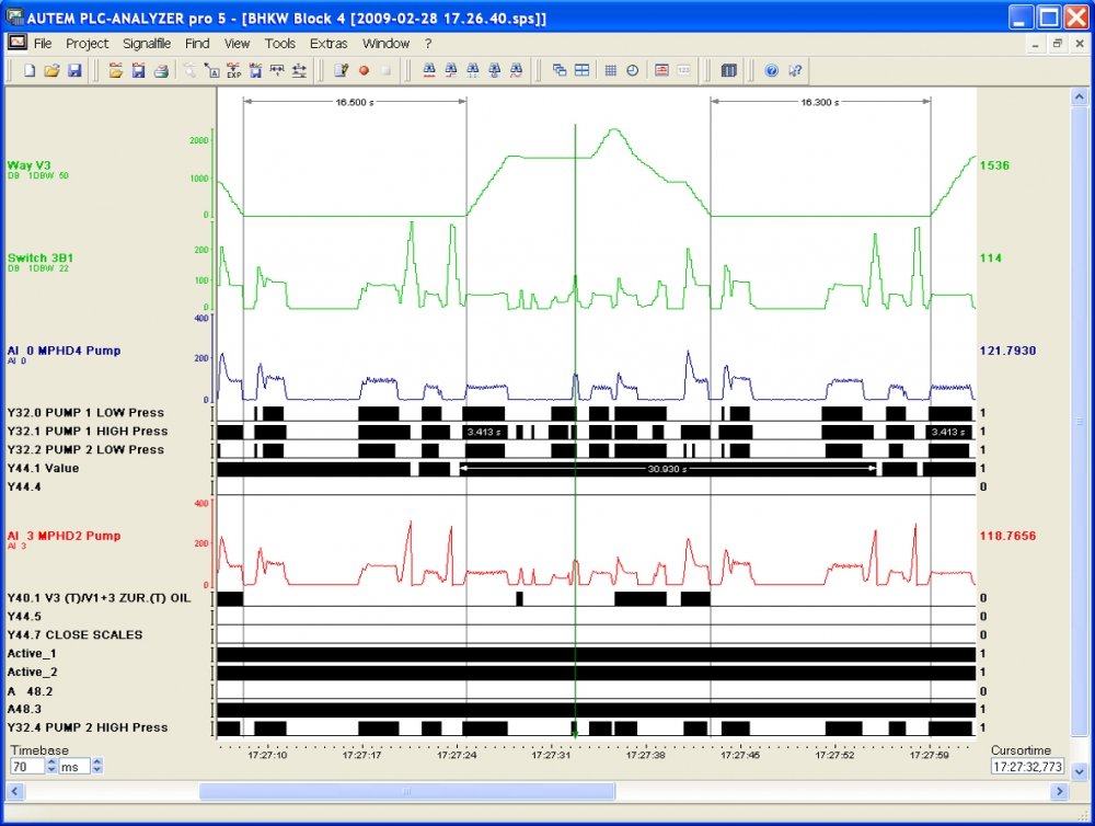 A PLC jelek rögzítése, ábrázolása és kiértékelése (bemenet, kimenet,változók, stb.) ezen program segítségével könnyen megoldható.